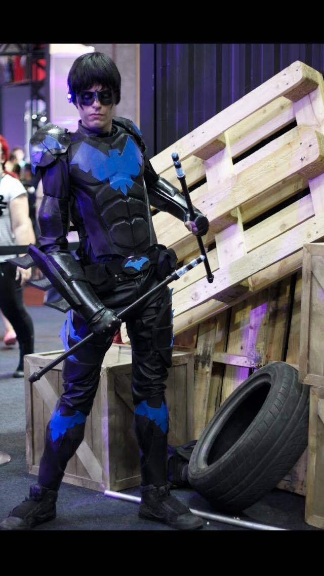Dick Grayson, mais conhecido como Asa Noturna, irá fazer a diferença no seu evento. É um super-herói cheio de habilidades, com um figurino incrível, levando os seus bastões que emitem uma luz azul.
