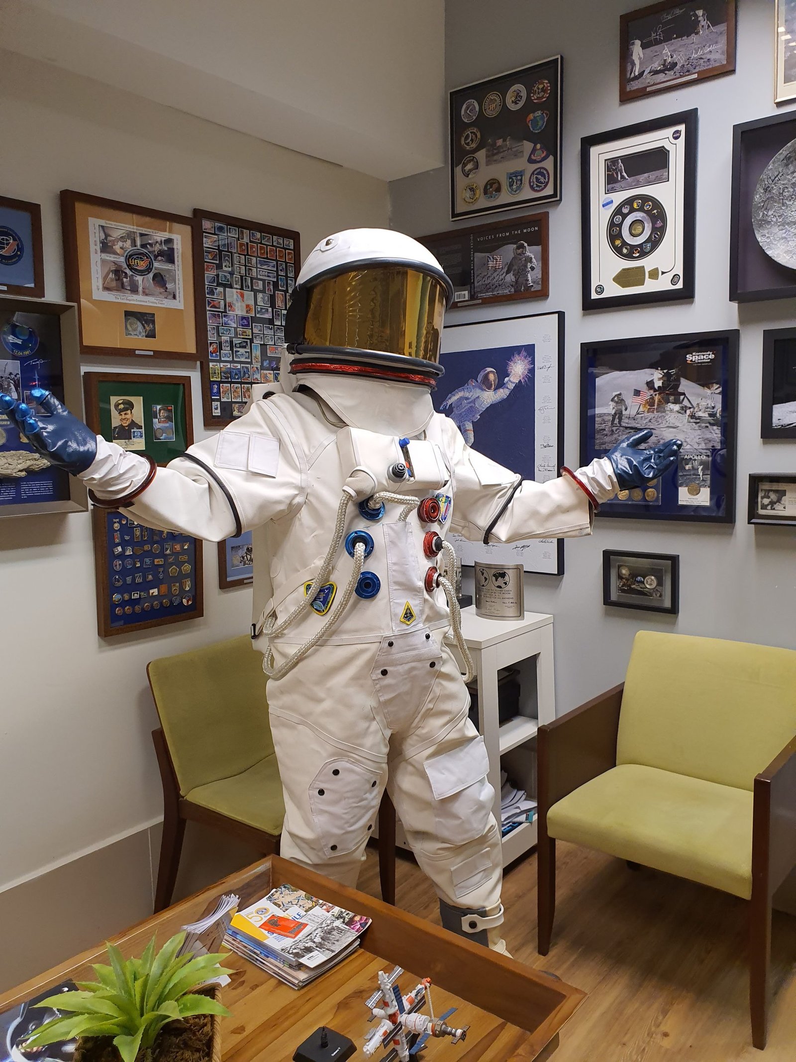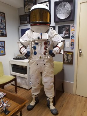 Além do capacete marcante com vidro refletivo, ele possui uma mochila de sobrevivência com patches da NASA e da missão espacial brasileira, além do macacão em tecido branco espesso, como usado no espaço, tubos de pressão e equipamentos de controle no peito. As botas foram fielmente desenvolvidas buscando a máxima semelhança com a original.
