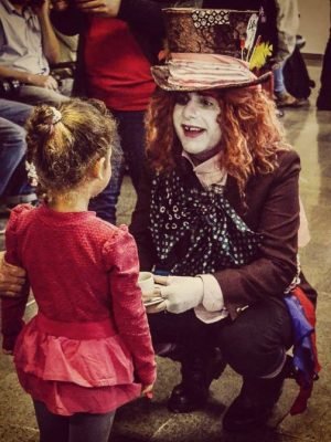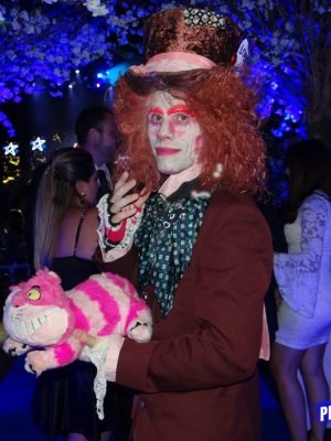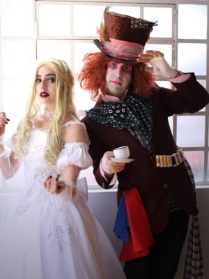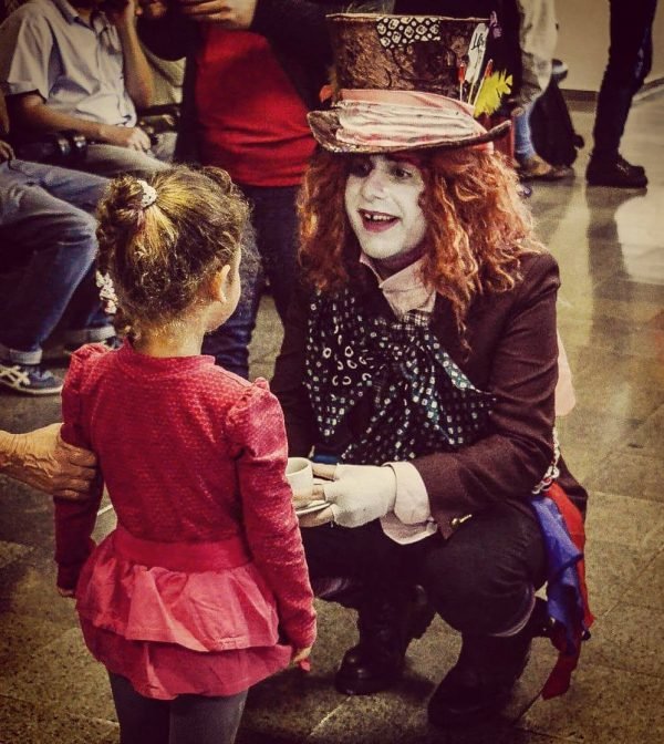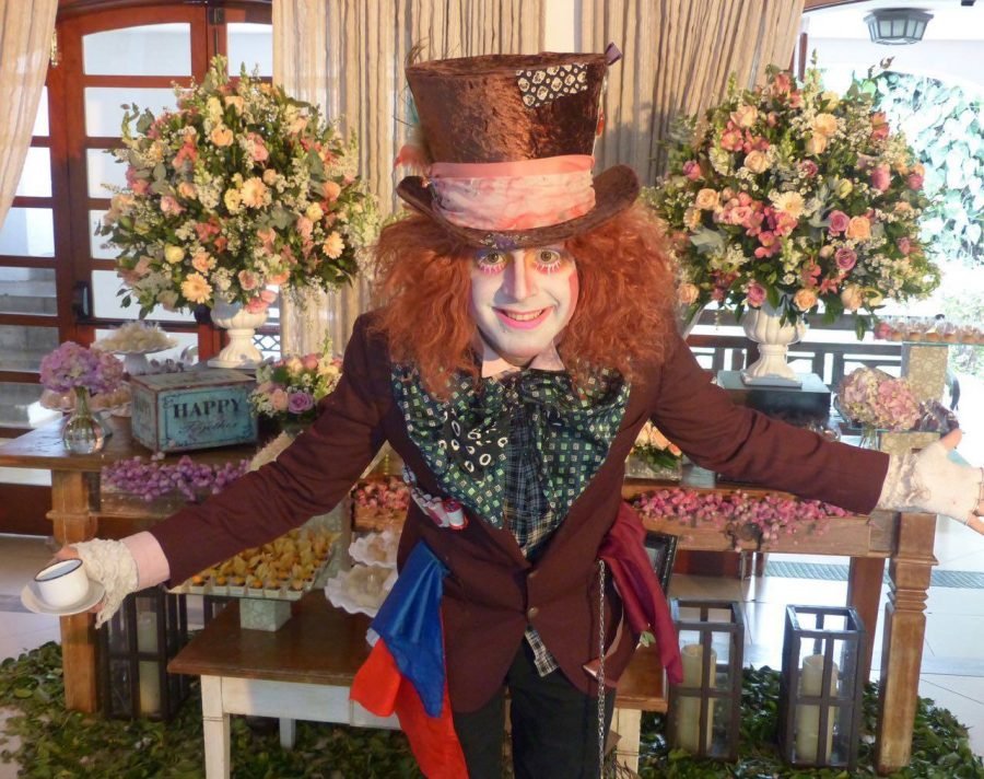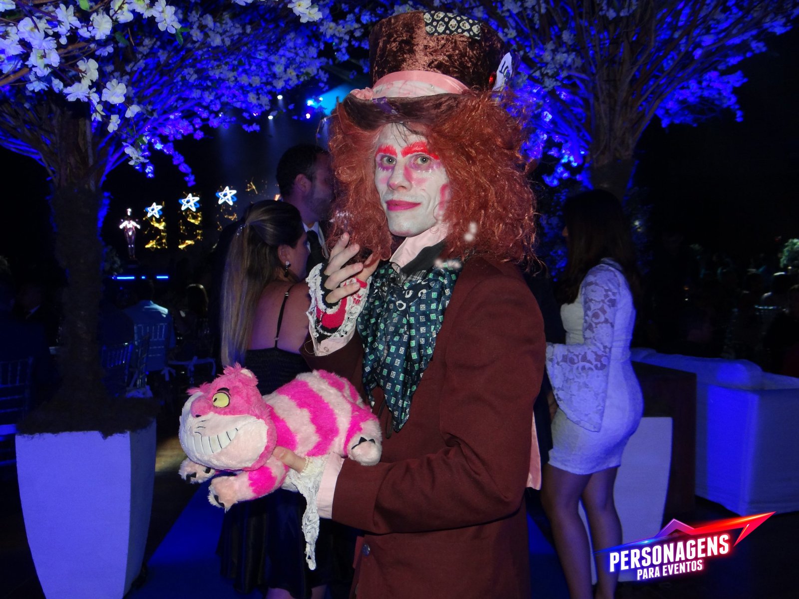Quem não ama o Chapeleiro Maluco? Difícil não se encantar por ele, e o nosso personagem tem esta mesma agradabilidade e simpatia. É um gentleman, sempre muito educado com todos, mas também doido, doidinho! Com o figurino todo colorido e um incrível chapéu, está sempre com a sua xícara de chá, sorrindo e animando todos. Ele promove um espetáculo a parte e garante ótimas fotos e registros na sua lembrança. Quando está entre uma turma de personagens, é o mais assediado!