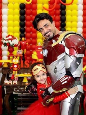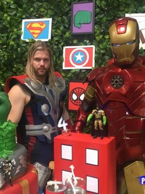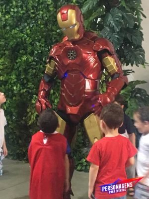 Um dos maiores sucessos do cinema contemporâneo é representado pelo Tony Stark e sua armadura biônica, materializada no Homem de Ferro. Agora esta armadura pode ser vista e tocada por você. Nosso personagem Homem de Ferro ja participou de diversas atividades de locação em eventos corporativos e de marketing. Ele sempre será presença marcante em animadas festas e confraternizações. Sua armadura chega a ser tão fiel ao filme que é muito comum a admiração do público, mesmo para aqueles mais fãs do filme podem atestar a fidelidade nos componentes.